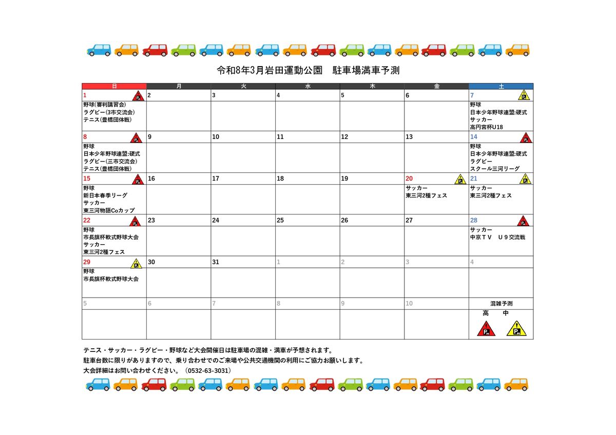 令和8年3月 岩田運動公園 駐車場混雑予測